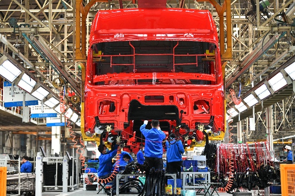 日前,陜西制造業(yè)龍頭企業(yè)之一的陜汽集團(tuán)重卡產(chǎn)能全面恢復(fù)。圖為工人在重卡總裝線工作。