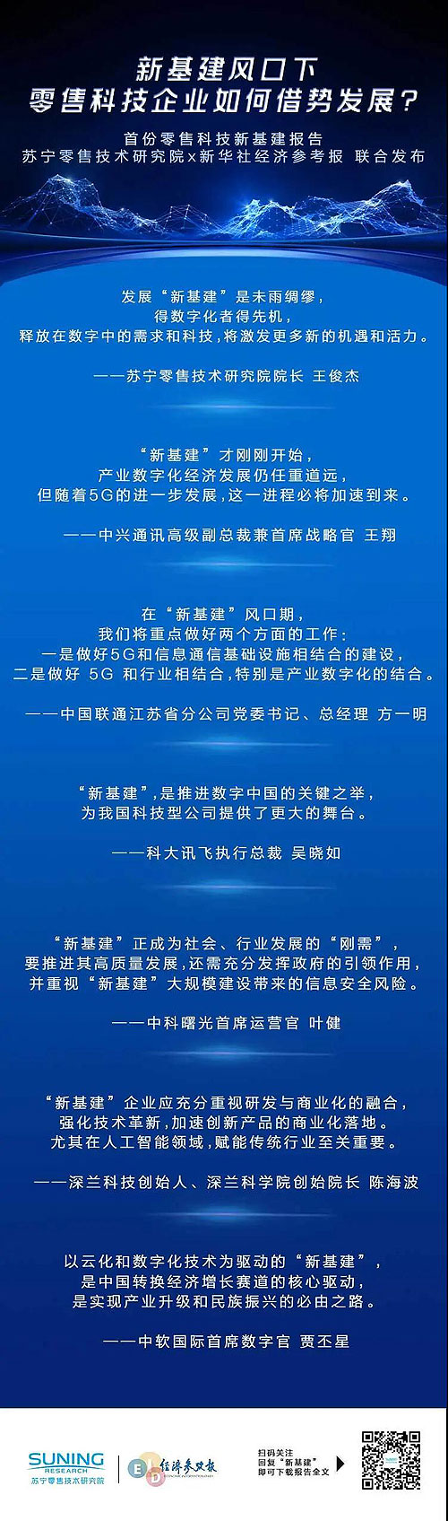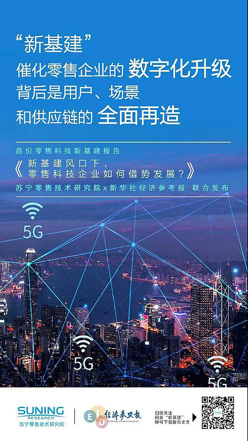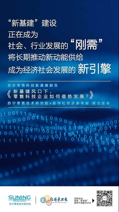 伴隨著今年政府工作報告正式將“新基建”作為推動我國經(jīng)濟高質(zhì)量發(fā)展的新動能,并對其任務(wù)目標明確部署,行業(yè)領(lǐng)路者們也踏上了助力新時代新發(fā)展的全新賽道。作為中國領(lǐng)先的智慧零售服務(wù)商,蘇寧已在“新基建”方面展開全場景布局實踐,蘇寧零售技術(shù)研究院和新華社經(jīng)濟參考報近日更是聯(lián)合發(fā)布首份零售科技行業(yè)的“新基建”深度調(diào)研報告。