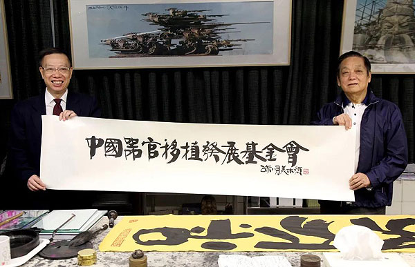 ▲韓美林與黃潔夫共同展示書法“中國器官移植發(fā)展基金會(huì)”