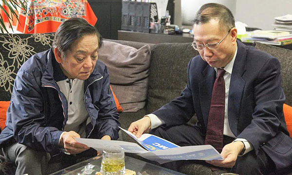▲韓美林與黃潔夫研究logo設(shè)計(jì)