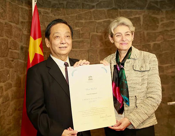 ▲2015年,時(shí)任聯(lián)合國教科文組織總干事博科娃給韓美林頒發(fā)“和平藝術(shù)家”證書
