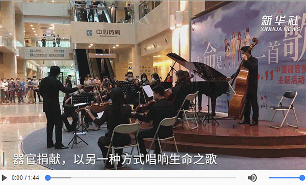 6月11日,由中國器官移植發(fā)展基金會發(fā)起的“6.11中國器官捐獻主題活動日”首次采用“云音樂節(jié)”直播,全國近50個城市的10所高校及110家大型醫(yī)院共同參與了線下的公眾宣傳教育活動。在浙江大學醫(yī)學院附屬第二醫(yī)院門診大廳,開啟了一場特別的交響音樂會表演。器官捐獻,讓生命的旋律得以延續(xù),以另一種方式唱響生命之歌。
