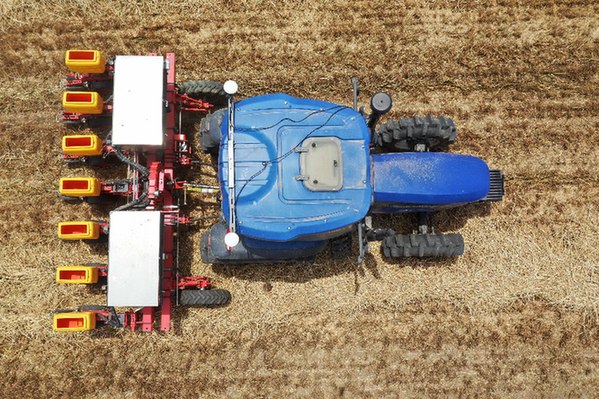 在河南省鄧州市小楊營鎮(zhèn)安眾村,加裝有北斗導航系統(tǒng)的拖拉機在無人駕駛狀態(tài)下播種。
