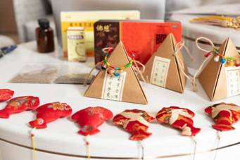 中藥香囊,在外觀方面,采用豌豆、回紋、葫蘆、五色等飽含中國吉祥寓意的造型和配色;在內(nèi)容方面,選用藿香、制蒼術(shù)、菖蒲、草果、艾葉、貫眾、薄荷腦等除穢醒腦的藥材。預(yù)防疾病、保健身體,時(shí)尚與傳統(tǒng)在這些香囊上瑰麗跨界、交融碰撞。