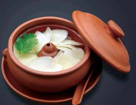 主持人張名和河南廣播電視臺主持人陶真與李志順,一邊吃一邊聊起蘊含在美食中的傳承和創(chuàng)新。第一道湯“酸辣烏魚蛋湯”,這道湯看似清如水,實際上是用雞、鴨和豬肘子熬制而成,再用雞胸肉茸吸附雜質(zhì),才能做到味道濃郁但又清澈如水,這種技法稱為“吊湯”。李志順還介紹,因為烏魚蛋遇到醋會發(fā)澀發(fā)硬,影響口感,因此,湯中酸味是經(jīng)過無數(shù)次調(diào)試,采用酸黃瓜汁調(diào)出酸味??此破椒驳臏澈笏N含的巧思和技法,讓觀眾們大開眼界。