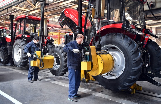 中國一拖員工在總裝車間流水線上作業(yè)。記者 李嘉南 攝