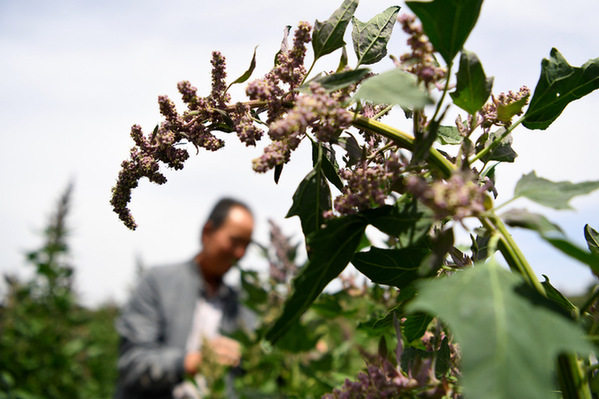 8月2日,天祝藏族自治縣松山鎮(zhèn)大溝興農(nóng)種養(yǎng)殖專(zhuān)業(yè)合作社負(fù)責(zé)人文玉廷在地里查看藜麥生長(zhǎng)情況。記者 陳斌 攝