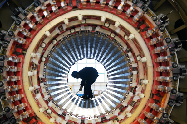 在哈電集團(tuán)哈爾濱電機(jī)廠有限責(zé)任公司的生產(chǎn)車間,工人在進(jìn)行生產(chǎn)作業(yè)。