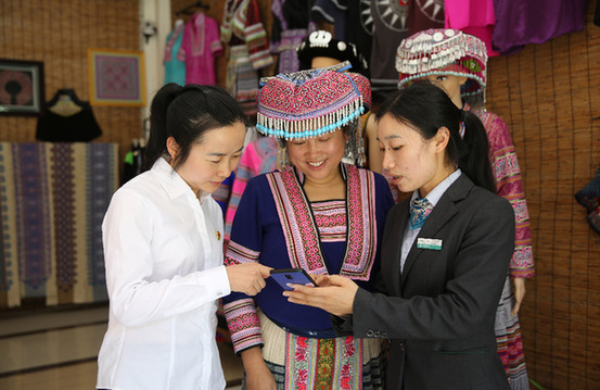 農(nóng)行云南屏邊縣支行有效支持“苗繡”發(fā)展,農(nóng)行職工為合作社負(fù)責(zé)人安裝掌上銀行。梁志強(qiáng) 攝