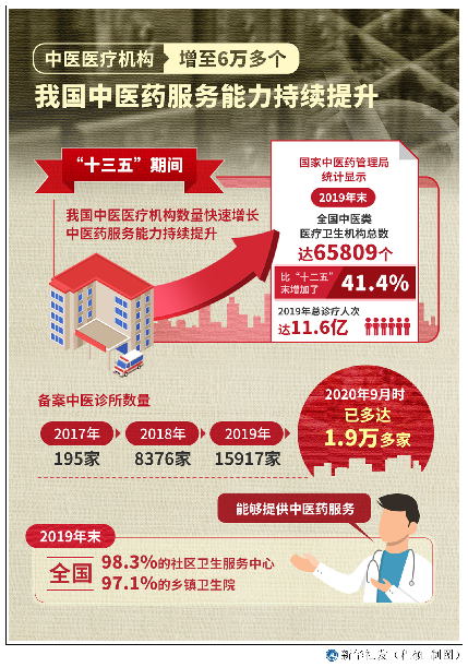 中醫(yī)醫(yī)療機(jī)構(gòu)增至6萬多個(gè) 我國中醫(yī)藥服務(wù)能力持續(xù)提升。新華社發(fā) 程碩 制圖