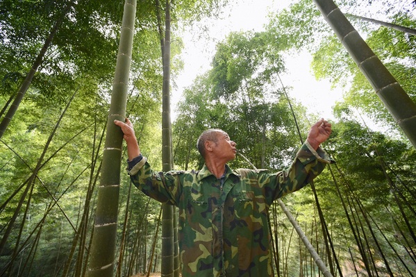 三明永安市洪田鎮(zhèn)湍石村村民在查看毛竹長(zhǎng)勢(shì)。記者 姜克紅 攝