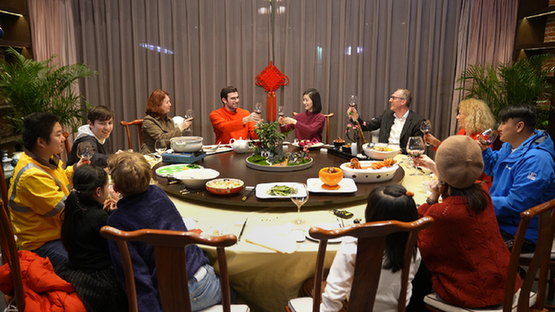 在武漢生活多年的外國人克萊因、海龍、高佑思,春節(jié)期間在武漢與雷神山、火神山醫(yī)院建設者,外賣小哥等共同慶祝新年。記者 熊琦 攝