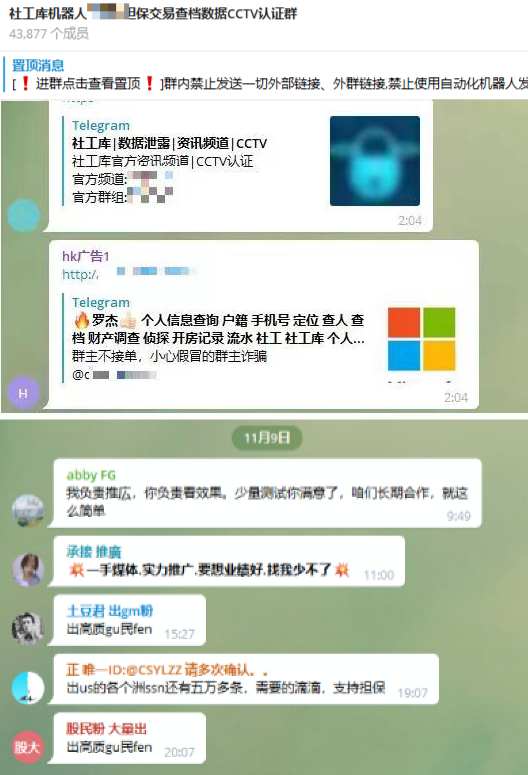 近期,記者在Telegram上一個(gè)名為“社工機(jī)器人&閑魚擔(dān)保交易查檔數(shù)據(jù)某認(rèn)證群”的社交群上看到,大量的包括戶籍、手機(jī)號、定位、查人查檔、財(cái)產(chǎn)調(diào)查、開房記錄、流水等在內(nèi)的用戶信息被公開售賣,十分猖獗。