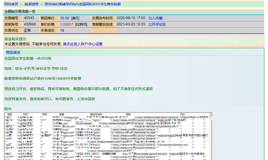記者在暗網(wǎng)上看到,一份標(biāo)稱剛出庫的某輔導(dǎo)機(jī)構(gòu)全國高校93萬學(xué)生身份數(shù)據(jù)售賣,打包價(jià)格為30美元。發(fā)帖者稱,數(shù)據(jù)是網(wǎng)站記錄的2016年到2018年的注冊數(shù)據(jù),里面包括姓名、手機(jī)號、學(xué)校、住址等信息。目前該數(shù)據(jù)包顯示已有18次成交。