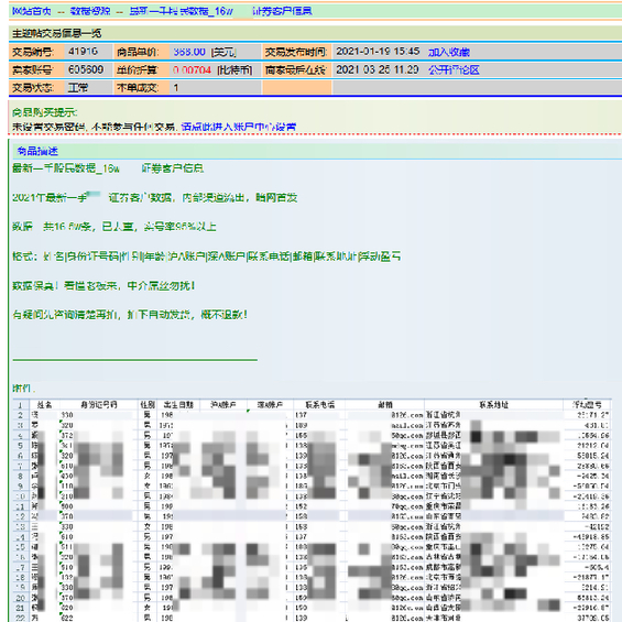 另一個(gè)在售的數(shù)據(jù)包為某證券公司多達(dá)16萬的客戶信息,標(biāo)價(jià)368美元。發(fā)帖者表示,該數(shù)據(jù)為2021年最新一手客戶數(shù)據(jù),內(nèi)部渠道流出,暗網(wǎng)首發(fā)?!皵?shù)據(jù)一共16.5萬條,已去重,實(shí)號率95%以上,數(shù)據(jù)保真。”