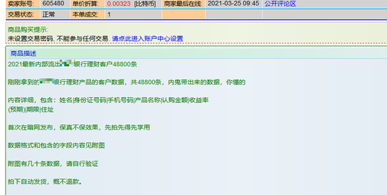 交易編號為41847的帖子顯示,其擁有前述商業(yè)銀行理財(cái)客戶數(shù)據(jù)48800條?!霸摂?shù)據(jù)為內(nèi)鬼帶出,首次在暗網(wǎng)發(fā)布,每份售價(jià)168美元。”發(fā)帖者稱。
