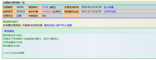 除了黑客等技術(shù)人員盜取批量信息之外,也有一些“內(nèi)鬼”直接參與其中。交易編號為40046的帖子顯示:“只要提供身份證和姓名信息,便可代查名下所有銀行卡具體信息,不帶余額1100美元,結(jié)果帶余額需2200美元,1-5個(gè)工作日即可出結(jié)果?!敝档米⒁獾氖?,該貼自2020年8月24日發(fā)布以來,目前已交易多達(dá)360單。
