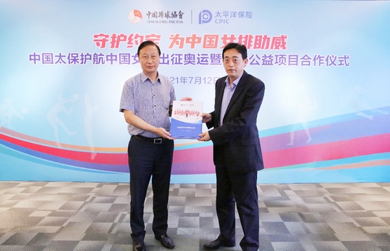 7月12日,中國太保向國家體育總局排球運(yùn)動管理中心遞送中國女排專屬定制保單。(中國太保供圖)