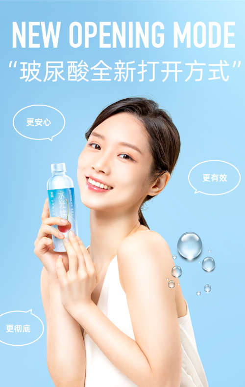 此次宜簡推出的水光飲玻尿酸飲品,每瓶含玻尿酸成分68mg。相較市面上含有玻尿酸成分的產(chǎn)品,一片玻尿酸面膜的含量約為5-15mg,一支玻尿酸針劑的含量約20mg,宜簡水光飲一瓶68mg的添加量無疑是具備市場競爭力的。據(jù)悉,該核心成分源自玻尿酸龍頭企業(yè)--華熙生物的專利原料。據(jù)華熙生物研究,玻尿酸具有良好的保濕性和增強皮膚組織彈性功能,1g玻尿酸可結(jié)合1kg水分,持續(xù)性的補充可以清除體內(nèi)自由基從而延緩組織衰老。簡而言之,就是增加皮膚水分、抗氧化和抗衰老。