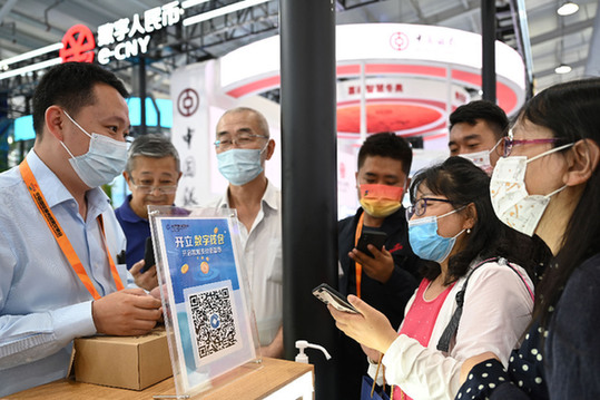 在2021年中國國際服務貿易交易會金融服務專題展區(qū),觀眾在咨詢數字人民幣支付業(yè)務。