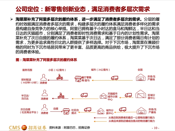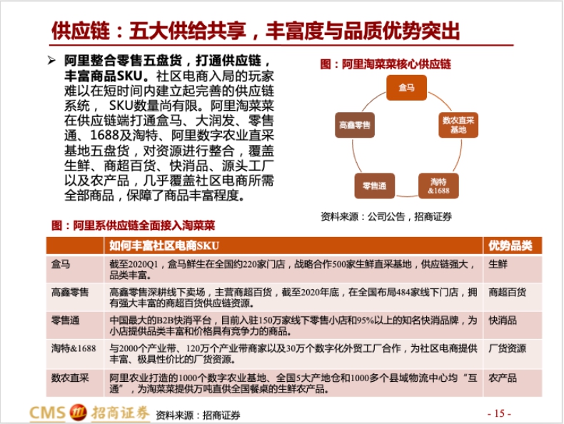 ????招商證券認(rèn)為,淘菜菜對(duì)商品質(zhì)量要求更為嚴(yán)格,商品品質(zhì)優(yōu)于競(jìng)對(duì)。農(nóng)產(chǎn)品和生鮮具有非標(biāo)、易損等特點(diǎn),供應(yīng)鏈相對(duì)復(fù)雜。淘菜菜從供應(yīng)鏈源頭把控產(chǎn)品品質(zhì),為1671款生鮮制定了16道品質(zhì)管控流程。在履約端,目前淘菜菜三溫層倉(cāng)運(yùn)冷鏈覆蓋率達(dá)到100%,中午12點(diǎn)送達(dá)率超過(guò)99%,均為行業(yè)領(lǐng)先。此外,淘菜菜還獲得菜鳥(niǎo)支持。后者網(wǎng)絡(luò)體系龐大,覆蓋全國(guó)2700多個(gè)區(qū)縣,能夠與淘菜菜形成良好的協(xié)同效應(yīng)。