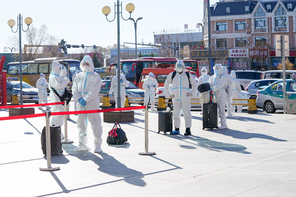 手拿轉運者的信息表、身穿防護服、頭戴隔離面罩,黑河市愛輝區(qū)西興街道工作人員正在一邊核對轉運者信息,一邊引導他們進入客運站。這些轉運者將在這里乘大巴前往隔離點進行集中隔離。