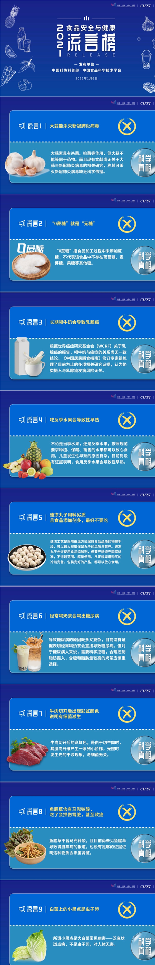 據(jù)悉,本次會議上,中國科協(xié)科普部和中國食品科學(xué)技術(shù)學(xué)會還聯(lián)合發(fā)布了《2021年食品安全與健康流言榜》。
