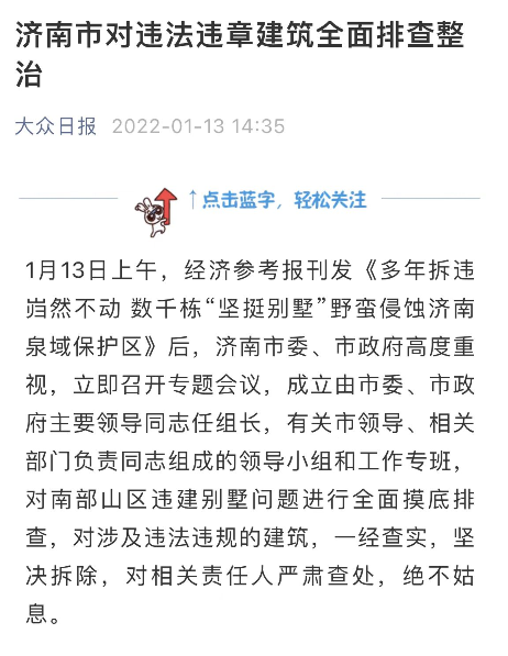 ? 1月13日下午,大眾日?qǐng)?bào)微信公眾號(hào)發(fā)布《濟(jì)南市對(duì)違法違章建筑全面排查整治》一文。文章稱:1月13日上午,經(jīng)濟(jì)參考報(bào)刊發(fā)《多年拆違巋然不動(dòng) 數(shù)千棟“堅(jiān)挺別墅”野蠻侵蝕濟(jì)南泉域保護(hù)區(qū)》后,濟(jì)南市委、市政府高度重視,立即召開專題會(huì)議,成立由市委、市政府主要領(lǐng)導(dǎo)同志任組長,有關(guān)市領(lǐng)導(dǎo)、相關(guān)部門負(fù)責(zé)同志組成的領(lǐng)導(dǎo)小組和工作專班,對(duì)南部山區(qū)違建別墅問題進(jìn)行全面摸底排查,對(duì)涉及違法違規(guī)的建筑,一經(jīng)查實(shí),堅(jiān)決拆除,對(duì)相關(guān)責(zé)任人嚴(yán)肅查處,絕不姑息。