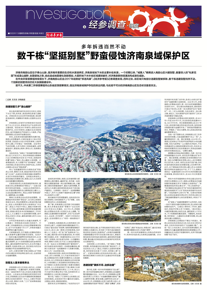 1月13日,《經(jīng)濟(jì)參考報(bào)》刊發(fā)調(diào)查報(bào)道《多年拆違巋然不動(dòng) 數(shù)千棟“堅(jiān)挺別墅”野蠻侵蝕濟(jì)南泉域保護(hù)區(qū)》。記者暗訪發(fā)現(xiàn):歷經(jīng)兩輪中央環(huán)保督察,四年過去,位于泰山山脈的濟(jì)南南部山區(qū),依然佇立著數(shù)千棟違建別墅!記者現(xiàn)場看到,一些地方“一處別墅糟蹋半座山”,長樹速度趕不上“長”別墅,個(gè)別新的別墅項(xiàng)目仍在大張旗鼓建設(shè)中。
