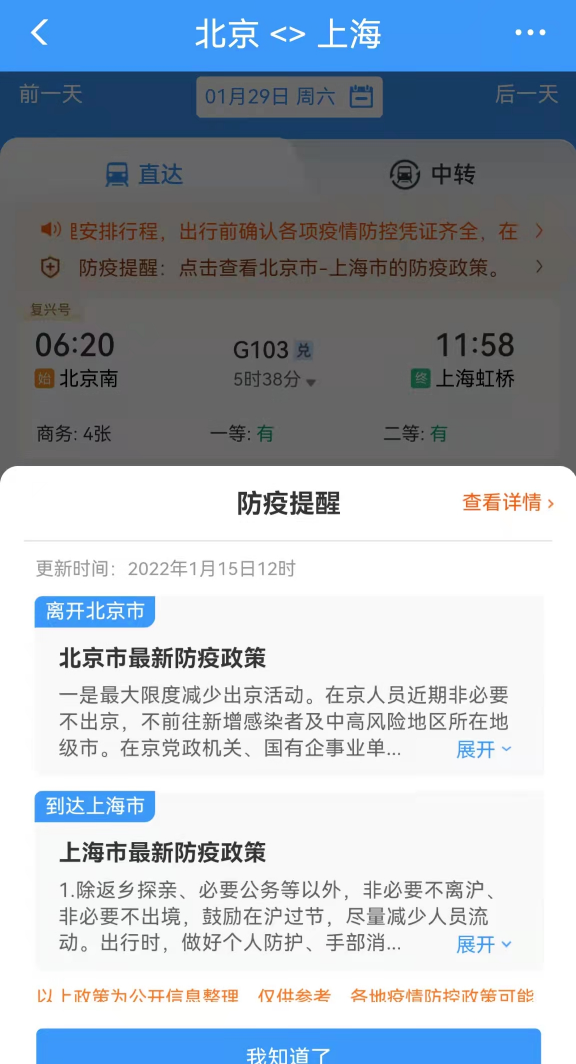 例如,查詢北京到上海的列車,在購票頁面的最上端可以看到兩地的“防疫提醒”。