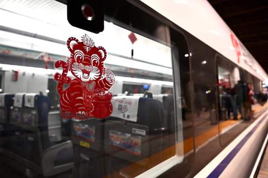 車窗上貼著姿態(tài)各異的小老虎窗花,行李架下方掛著大紅的福字,走進(jìn)G6737次列車的5號車廂,濃濃的年味撲面而來。