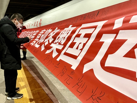 不少旅客拿起筆在寫有“2022春運首日起征程 喜迎冬奧國運興” 的條幅上寫下他們對新年的祝福?!翱挂弑貏佟薄靶碌囊荒觋柟鉅N爛”“中國加油!冬奧加油!”“2022家人平安”……