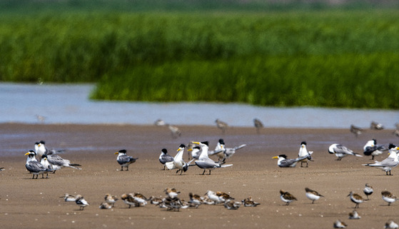 2020年4月19日9時(shí)許,閩江河口處于天文大潮最高潮位,急速上漲的潮水將水中的浮游生物沖上沙洲,記者藏匿于濕地核心區(qū)鱔魚灘沙洲高地,近距離“邂逅”黑嘴端鳳頭燕鷗。