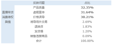 報告顯示,直播帶貨消費維權(quán)輿情反映的主要問題中,涉及產(chǎn)品質(zhì)量問題的占32.35%,虛假宣傳的占31.64%,價格誤導的占30.21%,誘導場外交易的占2.69%,退換貨的占1.83%,發(fā)貨慢的占1.20%,銷售違禁商品的占0.09%。其中,產(chǎn)品質(zhì)量、虛假宣傳、價格誤導等直播帶貨問題最為突出。