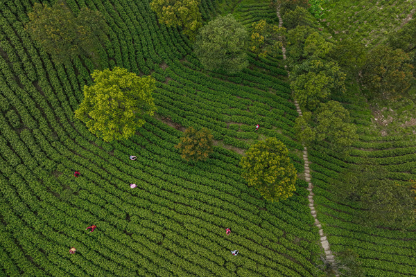 3月27日,茶農(nóng)在浙江省湖州市長興縣和平鎮(zhèn)灘龍橋村的高山茶園采摘茶鮮葉(無人機(jī)照片)。