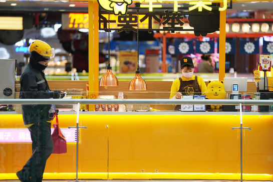 4月11日,在哈爾濱市香坊區(qū)一商業(yè)廣場內(nèi),一名外賣送餐員準(zhǔn)備離開餐飲區(qū)送餐。