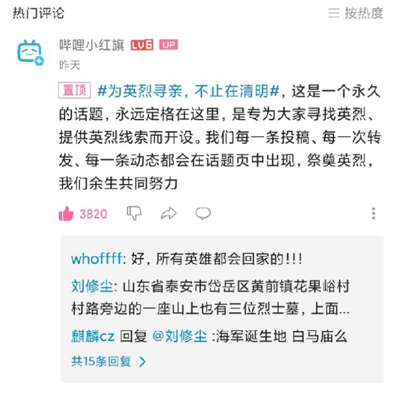 “為烈士尋親,不止在清明”。清明過(guò)后,B站為此還專門制作了話題主頁(yè),聚合相關(guān)信息,將“為烈士尋親”長(zhǎng)期化,引導(dǎo)和支持社會(huì)各界參與到這一活動(dòng)中去。