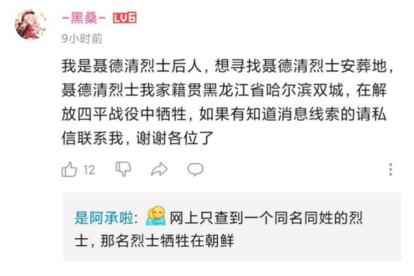網(wǎng)友還提供了更多烈士尋親的信息,如有網(wǎng)友說(shuō)自己是黑龍江哈爾濱籍烈士聶德清的后人,想尋找他的安葬地;另一位“家有烈士”的網(wǎng)友則想尋找四十七軍偵通連的何恩澤烈士的安葬地……