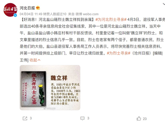 “為烈士尋親”活動(dòng)發(fā)起后,河北鹽山籍烈士魏立祥的親屬已經(jīng)在天津、河北等地找到,這鼓舞了更多的年輕網(wǎng)友。