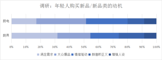 在此前京東發(fā)起的一項調(diào)研中,分析35歲以下人群購買廚房電器/廚具的動機可見,年輕人購買廚房電器時,受大眾口碑影響很大,而對廚具的顏值、設(shè)計感(增加人設(shè))的敏感度明顯更高。比如近幾年年輕人尤其是女性熱衷購買的顏值琺瑯鍋,無論是馬卡龍色還是鳶尾紫色,擺在廚房就是一道靚麗的風景線。京東春季家裝節(jié)數(shù)據(jù)顯示,鍋具顏值擔當?shù)拇砜岵市驴瞵m瑯鍋在開門紅的前28小時內(nèi)成交額同比增長15倍。