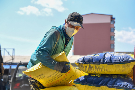 4月13日,在吉林市樺皮廠鎮(zhèn),農(nóng)資經(jīng)銷商在卸車。