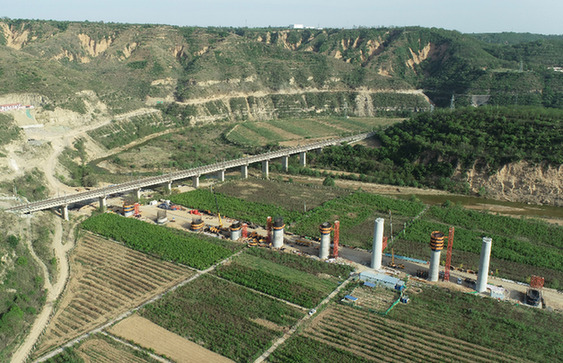 這是4月25日在延安市洛川縣拍攝的西延高鐵XYZQ-8標(biāo)段交口鎮(zhèn)北洛河特大橋施工現(xiàn)場(無人機(jī)照片)。