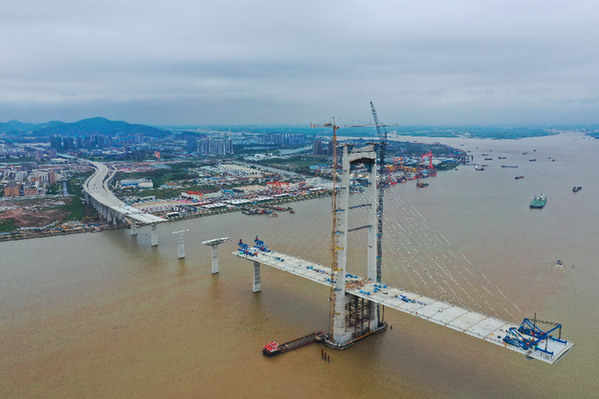正在進行箱梁架設(shè)的深中通道中山大橋建設(shè)現(xiàn)場(5月15日攝,無人機照片)。