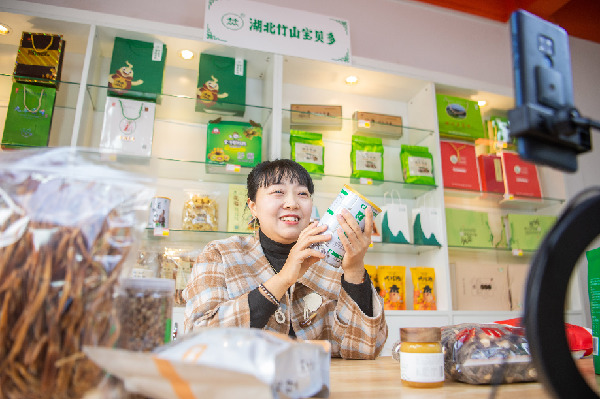 近年來,湖北省竹山縣采取培育電商從業(yè)人員、引入電商平臺、建設(shè)直播基地等方式,助力縣域產(chǎn)品線上銷售。圖為工作人員在竹山縣電商直播中心直播銷售特色農(nóng)產(chǎn)品。