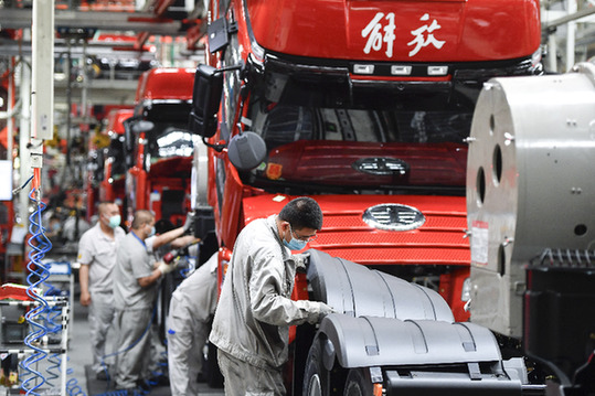 6月15日,工人在位于吉林長春的一汽解放總裝車間內(nèi)裝配車輛。