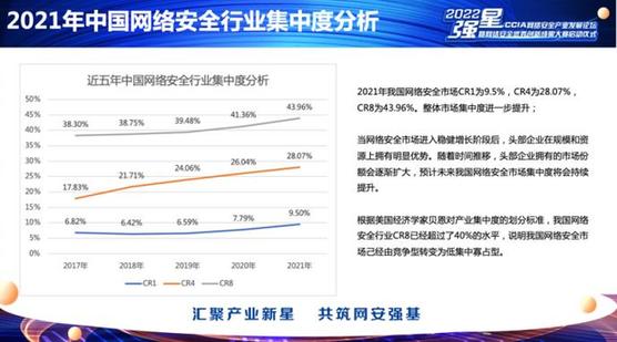 統(tǒng)計顯示,2021年,4家網(wǎng)絡(luò)安全頭部企業(yè)的市占率之和已超過市場總額的四分之一,其中奇安信一家就達到9.5%。據(jù)統(tǒng)計,在中國十大網(wǎng)絡(luò)安全產(chǎn)品中,奇安信占據(jù)了終端安全、安全服務(wù)、安全管理平臺、威脅情報、態(tài)勢感知和云安全六大網(wǎng)絡(luò)安全產(chǎn)品的市場份額第一。