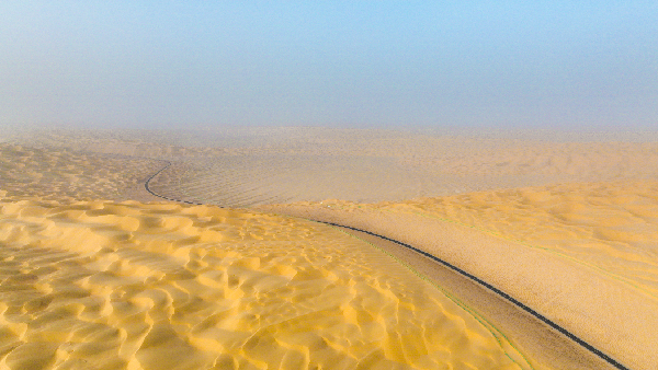 面對風沙肆虐的沙漠,建設者采取“草方格+阻沙障”的風沙防護工程,與公路建設同步推進,在公路兩側鋪設了5800萬平方米草方格和900多公里阻沙障阻擋風沙,有效避免公路被風沙掩埋。