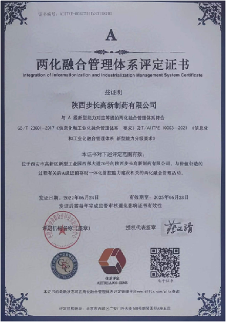 步長高新為積極響應(yīng)國家全面推廣信息化和工業(yè)化融合管理體系標準的政策,提升管理效率帶動企業(yè)技術(shù),產(chǎn)品與管理創(chuàng)新,提高企業(yè)核心競爭優(yōu)勢,通過對公司過程管理來持續(xù)打造企業(yè)信息化環(huán)境下新型能力,同時更好將信息化融入企業(yè)管理中,于2021年05月順利召開了兩化融合管理體系貫標啟動會,成立了兩化融合推行領(lǐng)導(dǎo)小組和工作小組。通過深入學習領(lǐng)會,按照GB/T23001-2017《信息化和工業(yè)化融合管理體系要求》及T/AIITRE10003-2021《信息化和工業(yè)化融合管理體系新型能力分級要求》最終完成兩化融合管理體系的文件編制與修訂、運行、內(nèi)部審核、管理評審等工作。經(jīng)逐級申報由西安市工業(yè)和信息化局最終審核通過,于2021年09月成功入選為西安市級兩化融合管理體系貫標試點企業(yè)。2022年04月通過了專家審核組的現(xiàn)場審核,經(jīng)國家兩化融合評定委員會評定,順利通過以打造“與價值創(chuàng)造的過程有關(guān)的A級進銷存財一體化管控能力建設(shè)”為兩化融合管理活動目標的認證工作。