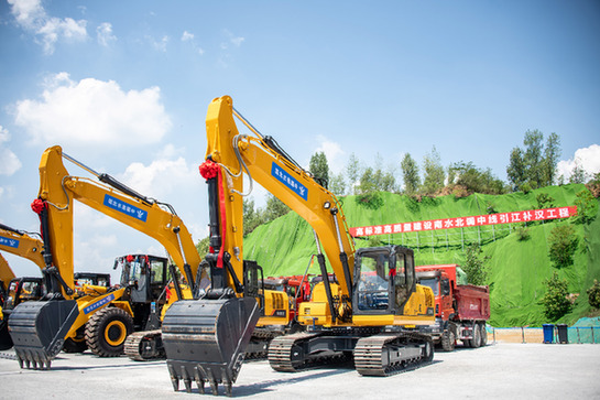 7月7日在引江補(bǔ)漢工程開(kāi)工現(xiàn)場(chǎng)拍攝的施工機(jī)械。