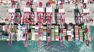 山東港口青島港前灣港區(qū),一艘集裝箱貨輪在碼頭裝卸集裝箱。 記者 李紫恒 攝